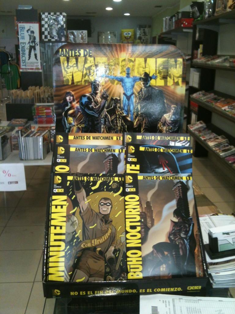 2) El otro día leía en Twitter que la librería castellonense Siragga había recibido gratuitamente un expositor de Antes de Watchmen de parte de la editorial ECC. Y también que era la hostia de difícil de montar... así que después de haber dejado unos días para la instalación, le he pedido que pase una foto para ver qué tal ha quedado. El resultado lo podéis ver junto a estas líneas.